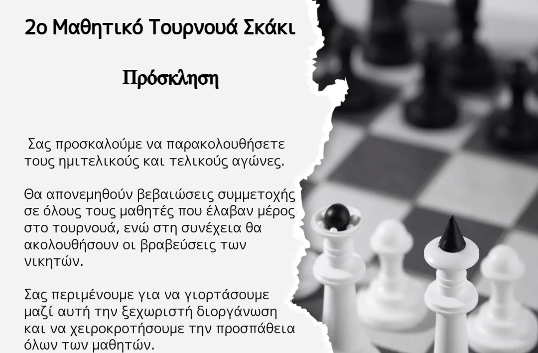Την Κυριακή 23 Μαρτίου, θα πραγματοποιηθούν οι ημιτελικοί και τελικοί αγώνες του 2ου Μαθητικού Τουρνουά Σκάκι, που διοργανώνονται από το 4ο Πειραματικό Δημοτικό Σχολείο Ερμούπολης.