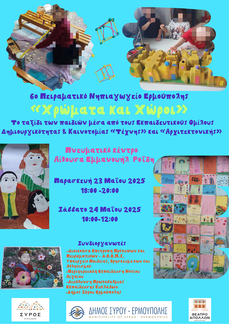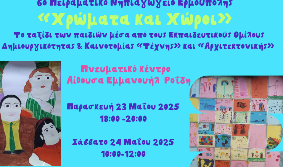 Την Παρασκευή 23 και το Σάββατο 24 Μαΐου θα πραγματοποιηθεί έκθεση στο Πνευματικό Κέντρο, στην αίθουσα "Εμμανουήλ Ροΐδη" στα πλαίσια ολοκλήρωσης των ομίλων δημιουργικότητας και καινοτομίας 2024-2025 του 6ου Πειραματικού Νηπιαγωγείου Ερμούπολης.