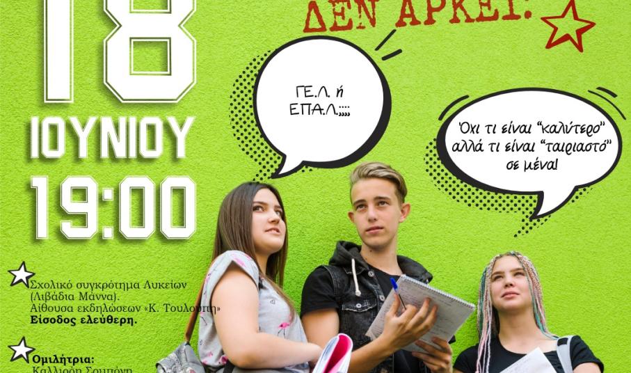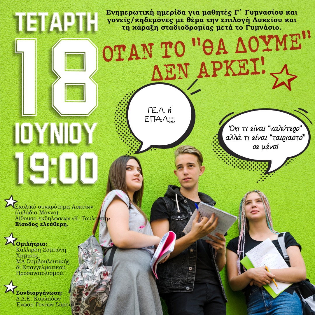 Με στόχο την ουσιαστική ενημέρωση των μαθητών και μαθητριών της Γ΄ Γυμνασίου και των γονέων, αλλά και κηδεμόνων τους, η Ένωση Γονέων Σύρου με τη συνδιοργάνωση της Διεύθυνσης Δευτεροβάθμιας Εκπαίδευσης, θα πραγματοποιήσει ημερίδα με θέμα "Όταν το “θα δούμε” δεν αρκεί"