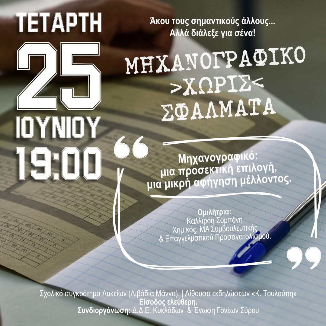 Διοργανώνεται την Τρίτη 25 Ιουνίου 2025, ημερίδα ενημέρωσης και Συμβουλευτικής υποστήριξης για τους απόφοιτους των Λυκείων της Σύρου(ΓΕ.Λ. και Π.ΕΠΑ.Λ. / ΕΠΑΛ) και τις οικογένειές τους, που συνδιοργανώνει η Δ.Δ.Ε. Κυκλάδων και η Ένωση Γονέων Σύρου, με τίτλο: "Μηχανογραφικό χωρίς σφάλματα - Άκου τους σημαντικούς άλλους, αλλά διάλεξε για σένα!".