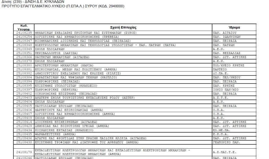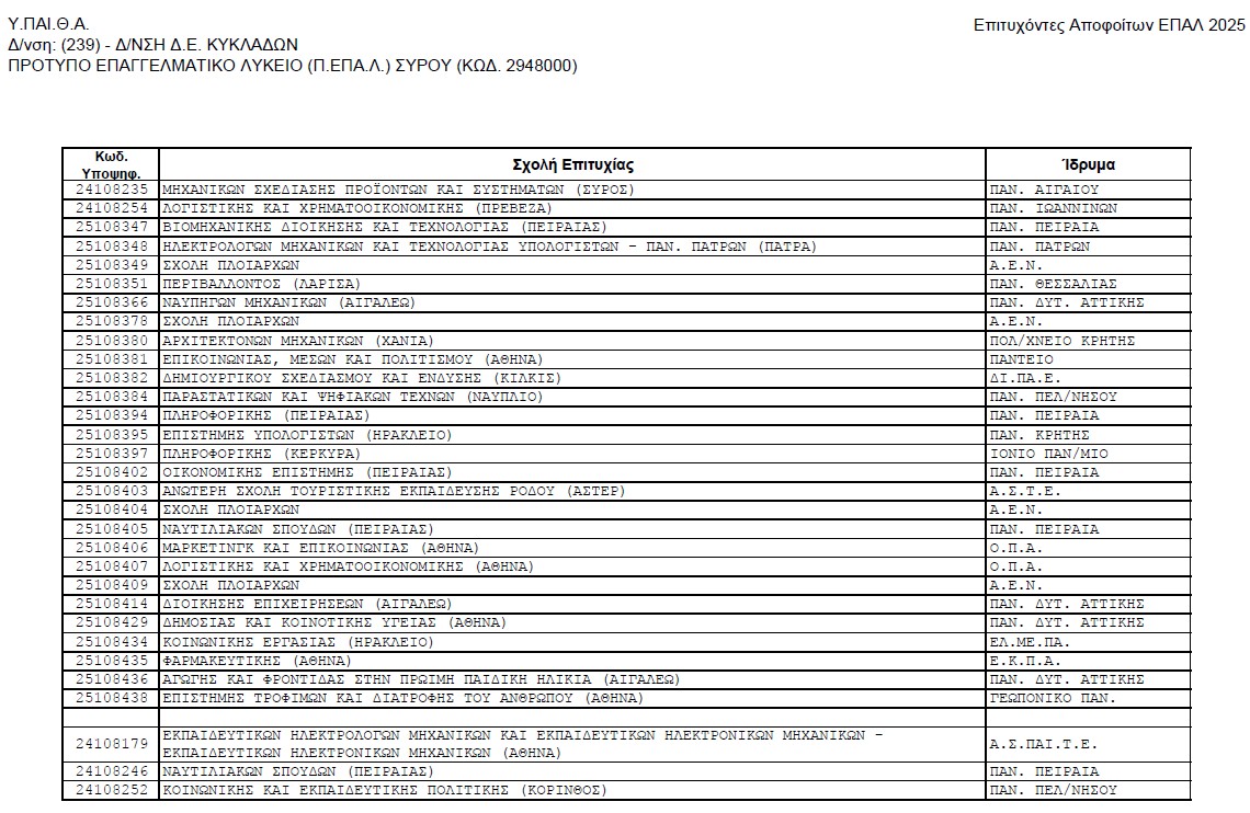 "Το ΕΠΑΛ Σύρου καταγράφει 30 επιτυχίες στις πανελλήνιες εξετάσεις, κάτι που ισοδυναμεί με πάνω από 50%", ανέφερε, από την πλευρά του, στην εφημερίδα ο διευθυντής του Πρότυπου Επαγγελματικού Λυκείου Σύρου, Επαμεινώνδας Λέστος.