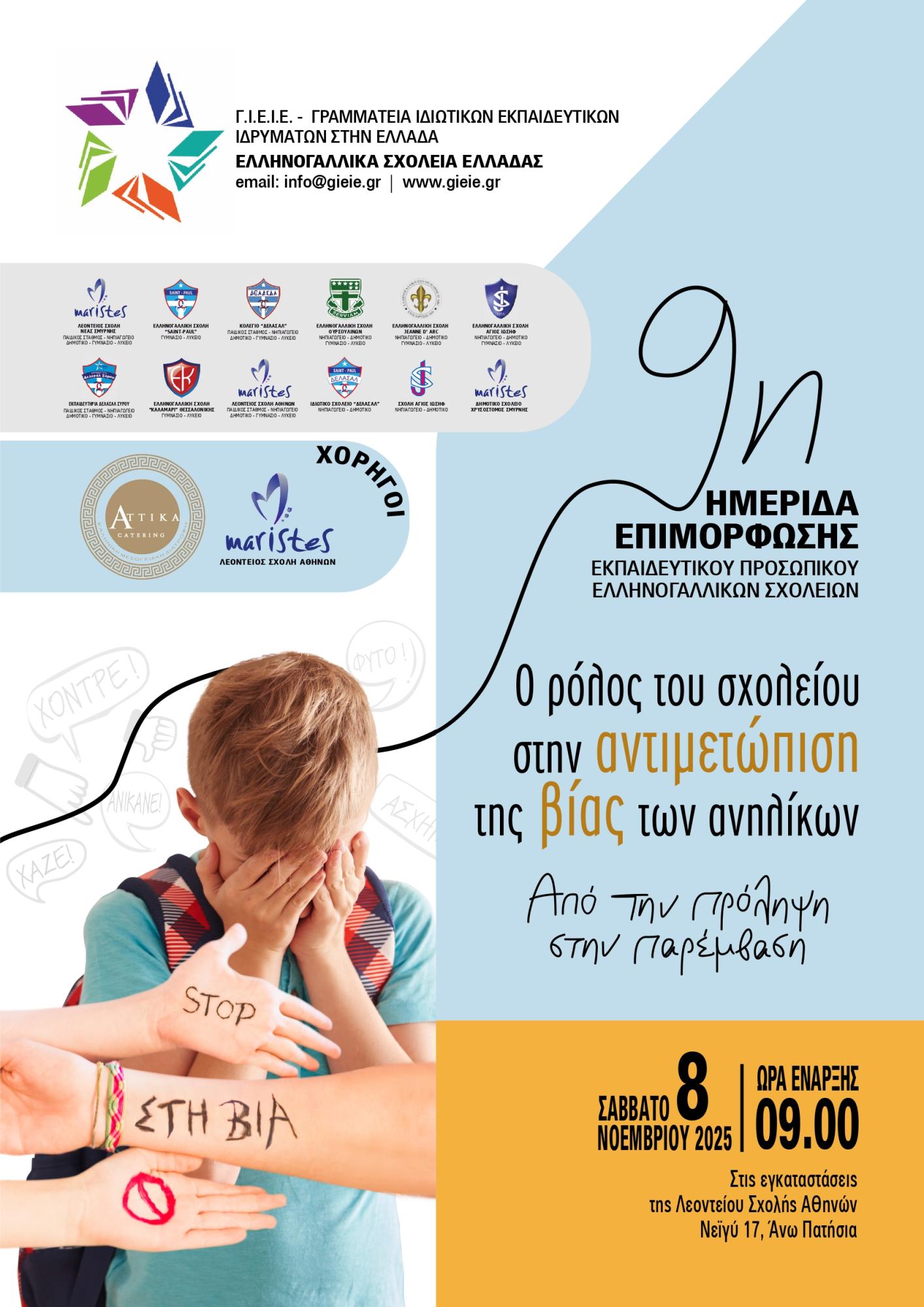 Η Γραμματεία Ιδιωτικών Εκπαιδευτικών Ιδρυμάτων στην Ελλάδα (Γ.Ι.Ε.Ι.Ε.), που αποτελεί Σύνδεσμο με μέλη τα Ελληνογαλλικά Σχολεία που ανήκουν σε Ιερές Μονές της Καθολικής Εκκλησίας, οργανώνει την 9η Ημερίδα Επιμόρφωσης για το Διδακτικό Προσωπικό των Ελληνογαλλικών Σχολείων, το Σάββατο, 8 Νοεμβρίου 2025, από τις 9.00 έως τις 17.00, στις εγκαταστάσεις της Λεοντείου Σχολής Αθηνών (οδός Νεϊγύ 17, Άνω Πατήσια), με θέμα: