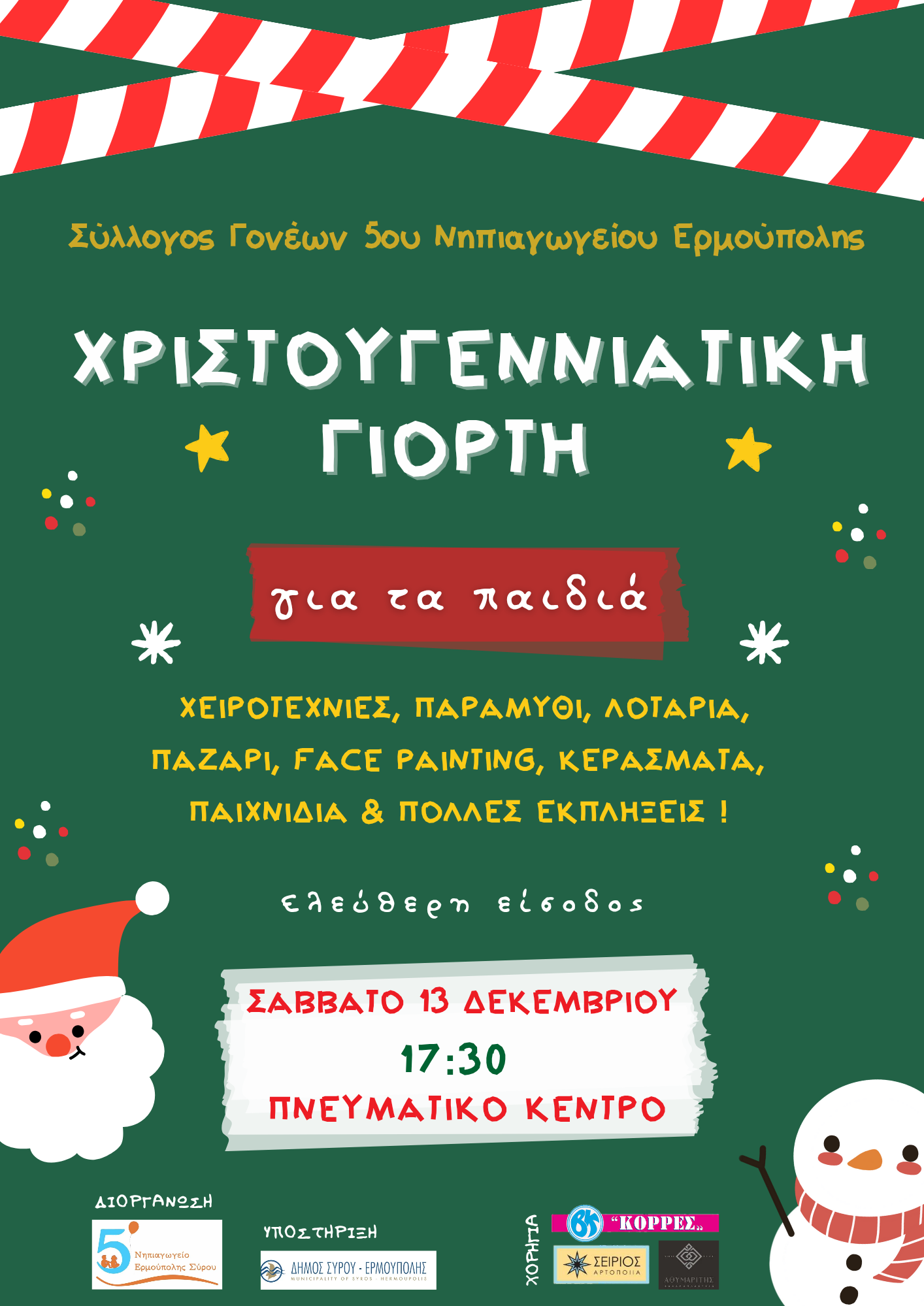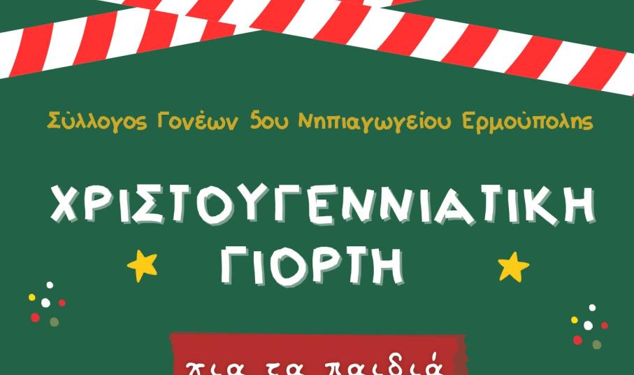 Μετά τη συμμετοχή του στο χριστουγεννιάτικο χωριό στις 6 και 7 Δεκεμβρίου, έφτασε η ώρα για τη χριστουγεννιάτικη γιορτή του Συλλόγου Γονέων και Κηδεμόνων του 5ου Νηπιαγωγείου Ερμούπολης, το Σάββατο 13 Δεκεμβρίου στο Πνευματικό Κέντρο, από τις 5 και μισή το απόγευμα και μετά.