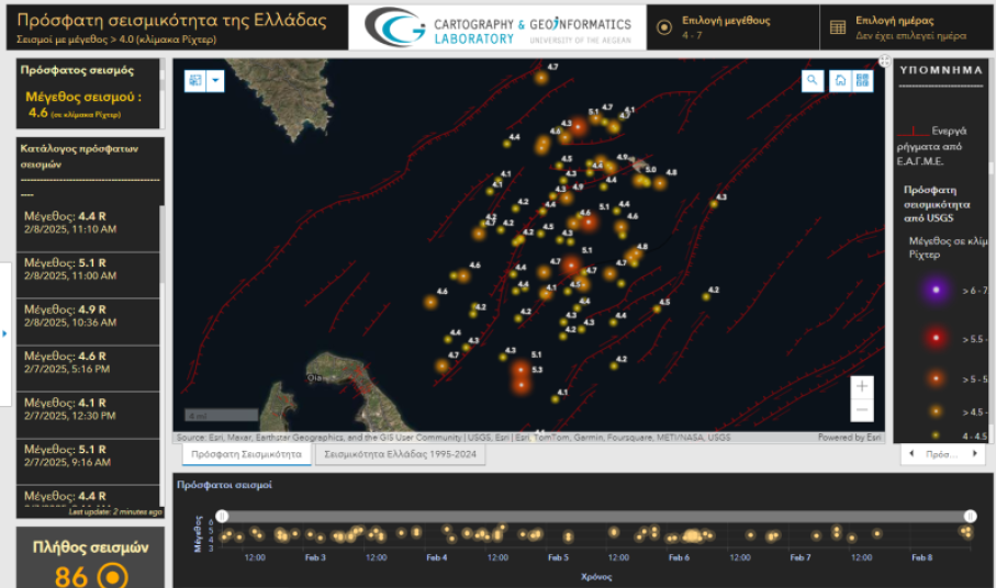 20/2: Το Πανεπιστήμιο Αιγαίου ανακοίνωσε την ανάπτυξη μιας ψηφιακής πλατφόρμας χαρτογράφησης και ανάλυσης σεισμών, που στοχεύει στην ενίσχυση της ενημέρωσης και της κατανόησης των σεισμικών φαινομένων στην περιοχή. Στόχος της πλατφόρμας είναι να υποστηρίξει εκπαιδευτικούς, μαθητές και ερευνητές με αξιόπιστα εργαλεία ανάλυσης δεδομένων σεισμών.