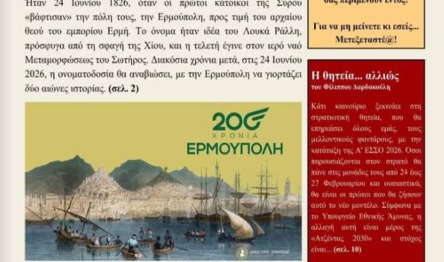 Στην επισήμανση ότι το πρώτο θέμα του εντύπου είναι αφιερωμένο στα 200 χρόνια από την ονοματοδοσία της Ερμούπολης, η υπεύθυνη καθηγήτρια σχολίασε ότι “όντως, πρόκειται για ένα άρθρο της Σοφιάννας Μαυροπούλου, η οποία πήρε υλικό από το φυλλάδιο του Δήμου Σύρου - Ερμούπολης το οποίο κυκλοφορεί για το σκοπό αυτό. Δυστυχώς, λόγω του περιορισμένου χρόνου που είχαν οι μαθητές, περιορίστηκαν στα άρθρα τους, χωρίς αυτά να επεκτείνουν με σχετικές συνεντεύξεις, αλλά και έρευνες. Γνωρίζουμε ότι έχει πολλές ελλείψεις το πρώτο μας φύλλο, αλλά σίγουρα η προσπάθεια μετράει”.