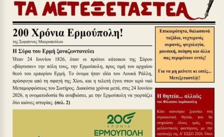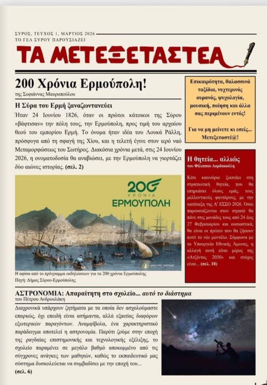 Τη νέα τους σχολική εφημερίδα με τον τίτλο “Τα Μετεξεταστέα”, δημιούργησαν και κυκλοφόρησαν οι μαθητές Α’ και Β’ τάξης του Γενικού Λυκείου Σύρου, με σκοπό τη συμμετοχή του στον διαγωνισμό σχολικών εφημερίδων και άρθρων της εφημερίδας το “ΒΗΜΑ”
