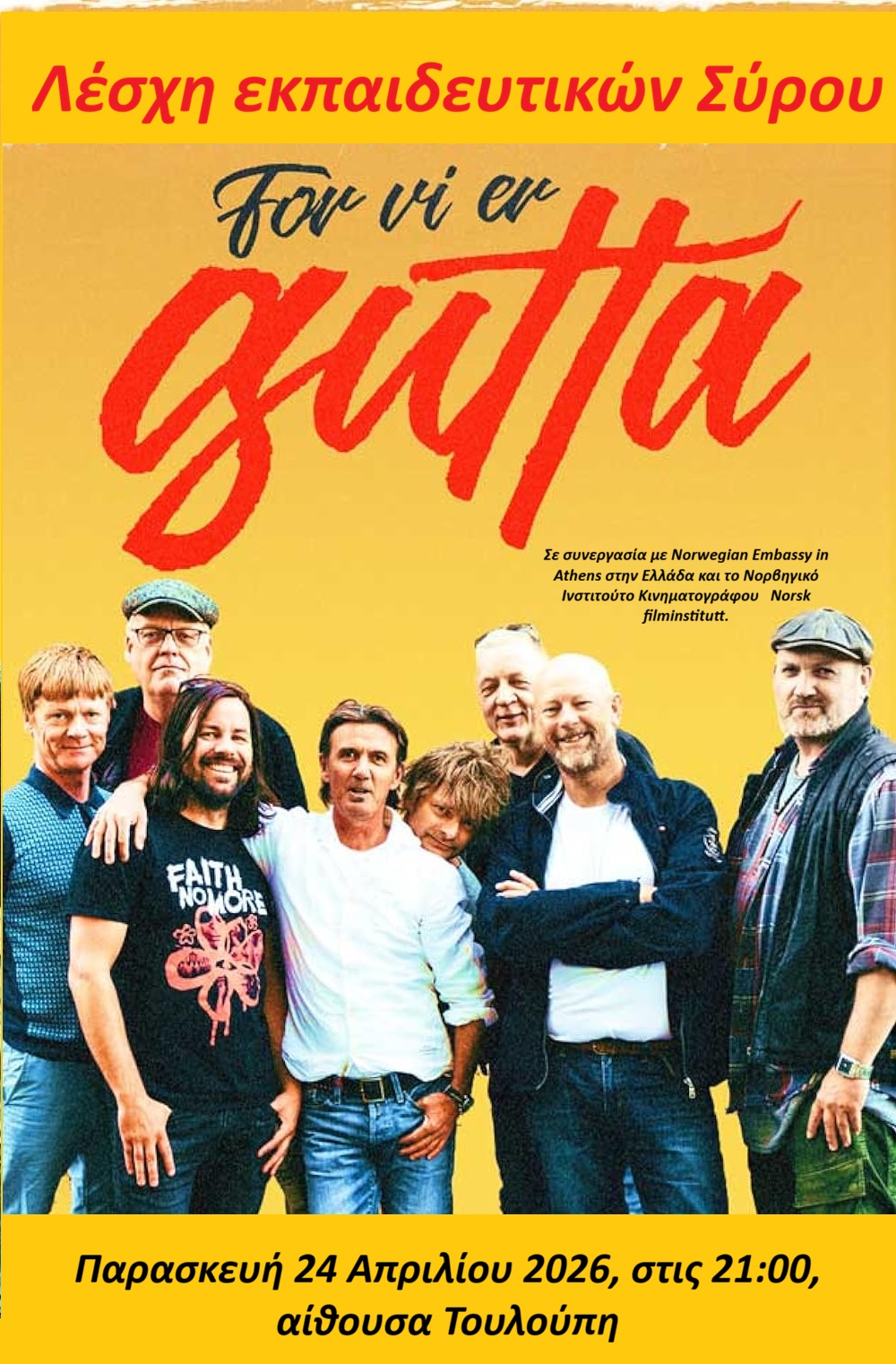Τελευταία Παρασκευή του Απρίλη και η Λέσχη Εκπαιδευτικών Σύρου, παρουσιάζει το νορβηγικό ντοκιμαντέρ “The Men's Room” σε σενάριο και σκηνοθεσία των Πίτερ Σόμερ και Τζο Βέμουντ Σβέντσον. Ο φακός των δύο δημιουργών παρακολουθεί μια αντρική χορωδία στο Όσλο που προετοιμάζεται για την πιο συγκλονιστική παράσταση της ζωής τους: θα ανοίξουν τη συναυλία των Black Sabbat μπροστά σε 10.000 θεατές