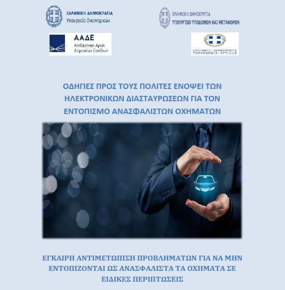 Στη σύνταξη και δημοσίευση πληροφοριακού οδηγού για την έγκαιρη αντιμετώπιση προβλημάτων που αφορούν στα ανασφάλιστα οχήματα, ώστε να αποτραπεί ο εντοπισμός, ως ανασφάλιστων, οχημάτων σε μια σειρά περιπτώσεων, προχώρησαν το Υπουργείο Οικονομικών, το Υπουργείο Υποδομών και Μεταφορών, η Ανεξάρτητη Αρχή Δημοσίων Εσόδων και η Γενική Διεύθυνση Μεταφορών και Επικοινωνιών της Περιφέρειας Αττικής.