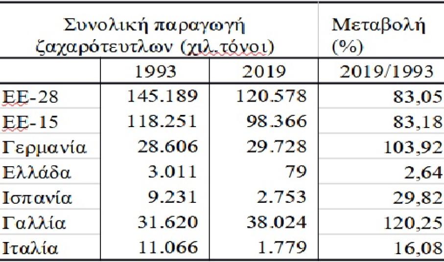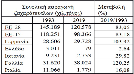 Οι πίνακες αυτοί αφορούν την παραγωγή ζάχαρης τόσο σε καλλιεργούμενα στρέμματα όσο και σε ύψος παραγωγής. Και στα δυο αυτά μεγέθη η κατακρήμνιση των τελικών ετήσιων στατιστικών είναι χαρακτηριστική και δεν αφορά καμιά άλλη χώρα παρά μόνο την Ελλάδα.
