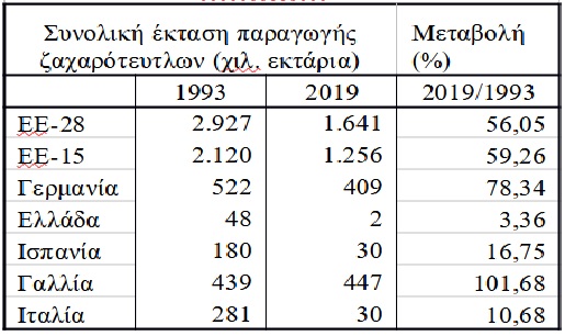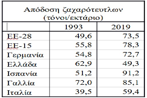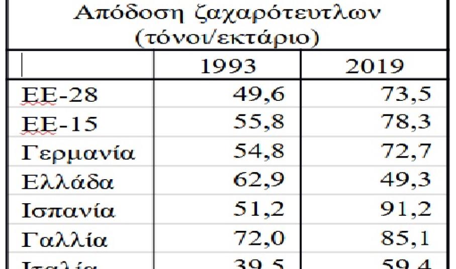 Εκείνο όμως το στοιχείο που εξοργίζει και τον πλέον καλόπιστο αναγνώστη και μελετητή των εξελίξεων είναι η απόδοση ζαχαρότευτλων (τόνοι/εκτάριο), όπου παρατηρείται στον πίνακα να κατείχε η Ελλάδα τη 2η καλύτερη θέση στο θέμα της απόδοσης και με τη μείωση των καλλιεργειών, για ανύπαρκτους όρους αποδόσεων, η ελληνική απόδοση έπεσε, σε σχέση με όλες, ανεξαιρέτως τις άλλες κοινοτικές χώρες μέχρι τον τελευταίο χρόνο που έχουμε στοιχεία, ήτοι το 2019. Είναι γνωστό δε, ότι με την βιομηχανική έκρηξη στον τομέα της ζάχαρης είχαμε μια πολύ καλή θέση (5 εργοστάσια ζάχαρης που λειτουργούσαν στο φουλ, στη χώρα μας).