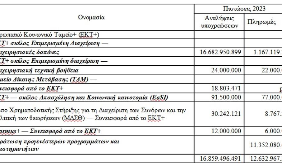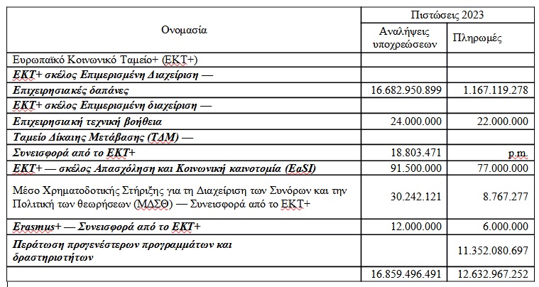 Όσον αφορά τις Επιχειρησιακές δαπάνες του ΕΚΤ+ οι αναλήψεις των 16,68 δις € ακολουθούνται από 1,17δις € πληρωμές, δεδομένων των απορροφήσεων σχεδίων προηγουμένων ετών. Σημειώνεται ότι οι πιστώσεις αυτές προορίζονται να καλύψουν δαπάνες που αποσκοπούν στη μείωση των οικονομικών, κοινωνικών και εδαφικών ανισοτήτων που έχουν ανακύψει, ιδίως σε χώρες και περιφέρειες που παρουσιάζουν καθυστέρηση στην ανάπτυξή τους, σε συνδυασμό με την επιτάχυνση της οικονομικής και κοινωνικής αναδιάρθρωσης, τη μετάβαση σε καθαρές μορφές ενέργειας, την ψηφιοποίηση του χώρου εργασίας, τις αυξανόμενες ελλείψεις σε δεξιότητες και εργατικό δυναμικό, καθώς και τις επιπτώσεις και τον αντίκτυπο των δημογραφικών μεταβολών, συμπεριλαμβανομένης της γήρανσης του πληθυσμού, ώστε να δημιουργηθεί μια πιο κοινωνική Ευρώπη. Δηλαδή εντάσσονται το σύνολο σχεδόν των τομέων κοινοτικής παρέμβασης