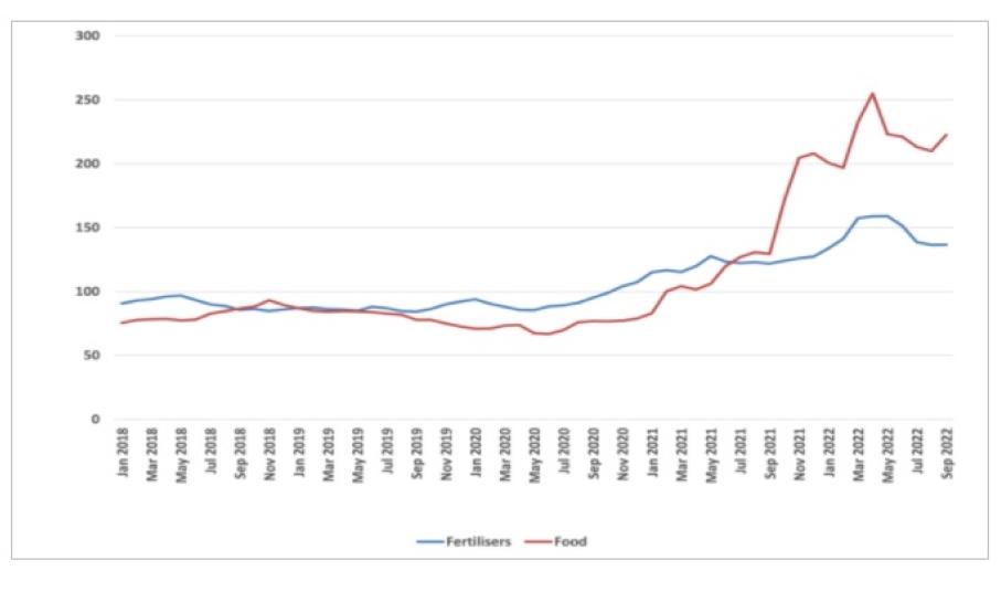 Στο ακόλουθο σχήμα που δείχνει η Παγκόσμια Τράπεζα τον Παγκόσμιος δείκτης τιμών λιπασμάτων και βασικών προϊόντων διατροφής (Δείκτης 100=2010), φαίνεται η τρελή κούρσα των λιπασμάτων τους τελευταίους μήνες