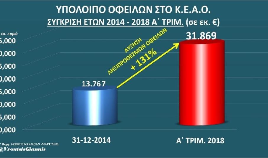 «Τα στοιχεία της 1ης τριμηνιαίας έκθεσης προόδου εργασιών του ΚΕΑΟ έτους 2018, αποκαλύπτουν ότι η κατάσταση στην πορεία των ληξιπροθέσμων οφειλών προς τα ασφαλιστικά ταμεία παραμένει δραματική, ενώ τα δήθεν σωτήρια μέτρα της ρύθμισης των 100 δόσεων και του εξωδικαστικού μηχανισμού ρύθμισης οφειλών επιχειρήσεων απέτυχαν παταγωδώς!