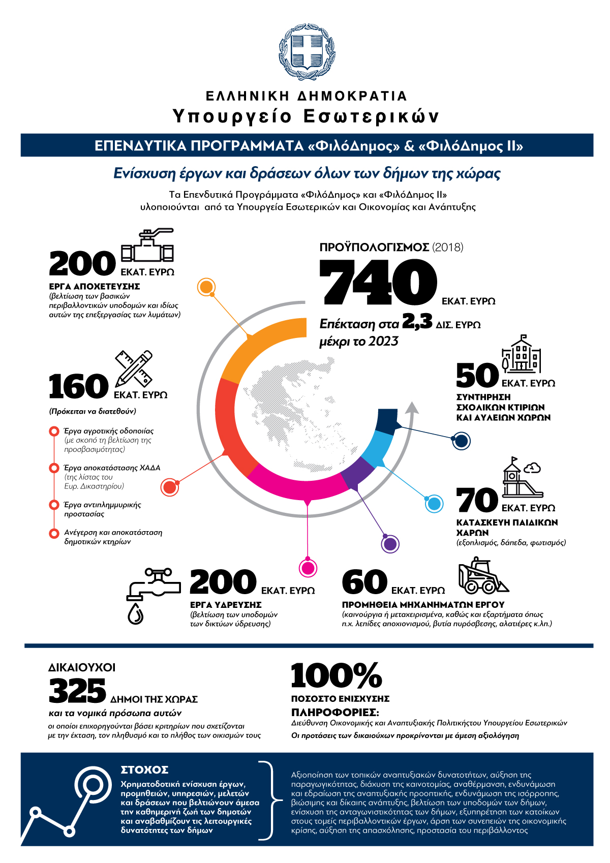 Στο πλαίσιο των Προσκλήσεων των Προγραμμάτων «ΦιλόΔημος» και «ΦιλόΔημος ΙΙ» του Υπουργείου Εσωτερικών, βάσει της Απόφασης 4748 (ΦΕΚ 612/22.2.2018), ο υπουργός Εσωτερικών, Πάνος Σκουρλέτης, ενέκρινε την ένταξη Πράξεων δήμων συνολικού ποσού ύψους 5.520.370,39 ευρώ, με τη συμμετοχή των δήμων να ανέρχεται στο ποσό των 805.802,39 ευρώ.