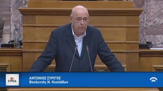 Κατά τη διάρκεια της συζήτησης για τη Βουλή, την Κυβέρνηση και την λαϊκή νομοθετική πρωτοβουλία τοποθετήθηκε ο Βουλευτής Κυκλάδων Αντώνης Συρίγος, ως ειδικός εισηγητής του ΣΥ.ΡΙΖ.Α. στην Επιτροπή για την Αναθεώρηση του Συντάγματος.