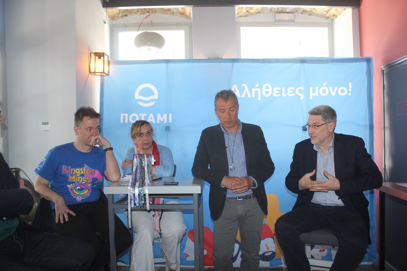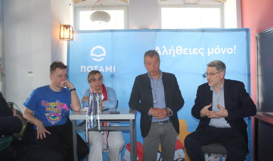 Ο ίδιος συνοδευόταν από τρεις υποψήφιους Ευρωβουλευτές του Ποταμιού και συγκεκριμένα τον Γιώργο Κορκόβελο, τη Μάρω Κακαβέλα και τον Θανάση Χειμωνά.