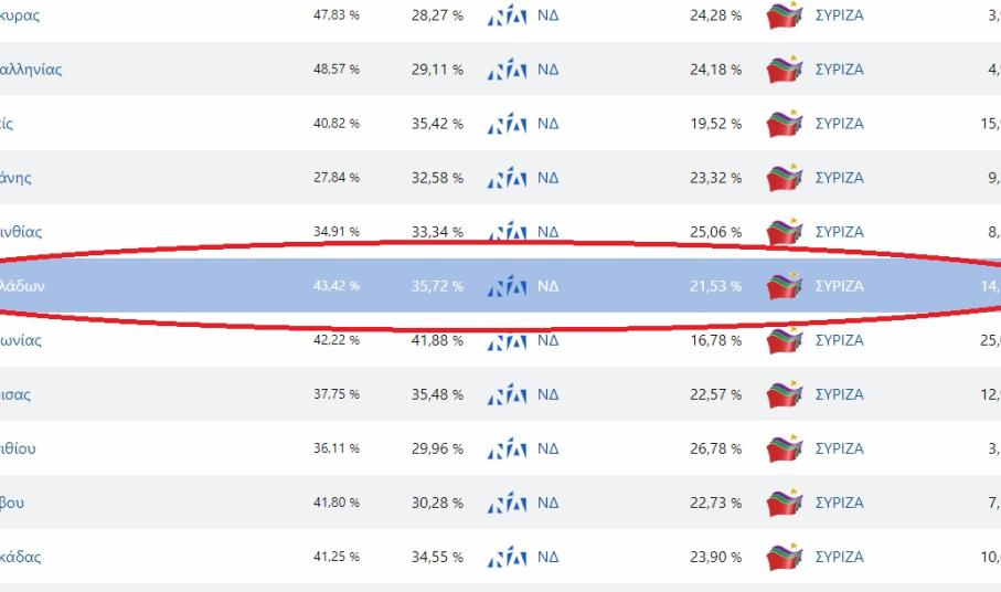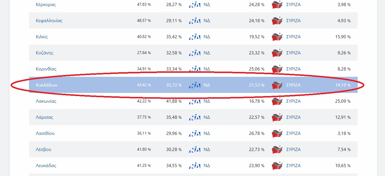Ειδικότερα, στο νομό Κυκλάδων, με 42,43% ενσωμάτωση των αποτελεσμάτων, η Νέα Δημοκρατία προηγείται με 35,8%, έναντι του ΣΥΡΙΖΑ – Προοδευτική Συμμαχία, που ακολουθεί με 21,04%, και τη διαφορά να ανέρχεται στο 14,86%.