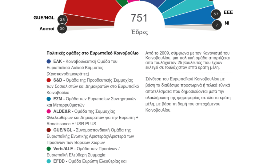 Σύμφωνα με τα προσωρινά αποτελέσματα, η πρώτη στατιστική προβολή για τη σύνθεση του Ευρωπαϊκού Κοινοβουλίου, βάσει επίσημων και προσωρινών αποτελεσμάτων σε 21 χώρες και εκτιμήσεων σε άλλες επτά, απεικονίζεται ως εξής: