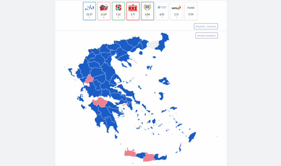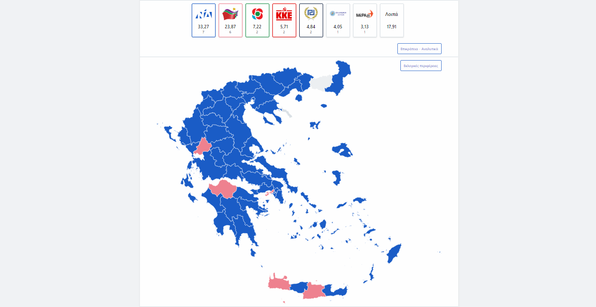 Στην επικράτεια, η “ψαλίδα” Νέας Δημοκρατίας – ΣΥΡΙΖΑ άνοιξε στις 10 μονάδες, με τη Νέα Δημοκρατία να συγκεντρώνει ποσοστό 33,2%, ο ΣΥΡΙΖΑ 23,8%, το Κίνημα Αλλαγής 7,2%, το ΚΚΕ 5,7%, η Χρυσή Αυγή 4,8%, η Ελληνική Λύση 4%, η ΜέΡΑ25 3,1% και τα λοιπά κόμματα, ποσοστό 17,9%, με ενσωμάτωση αποτελεσμάτων στο 50%.