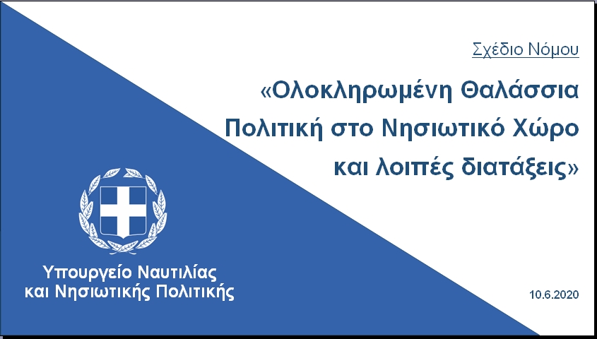 Τους βασικούς άξονες του σχεδίου νόμου για μία «ολοκληρωμένη θαλάσσια πολιτική στο νησιωτικό χώρο και λοιπές διατάξεις» παρουσίασε, μέσω τηλεσυνέντευξης τύπου, ο Υπουργός Ναυτιλίας και Νησιωτικής Πολιτικής κ. Γιάννης Πλακιωτάκης, τονίζοντας ότι «η βασική τομή του συγκεκριμένου νομοσχεδίου είναι ότι θεσμοθετείται για πρώτη φορά στην Ελλάδα, η υποχρέωση του κράτους για κατάρτιση ολοκληρωμένης νησιωτικής πολιτικής».