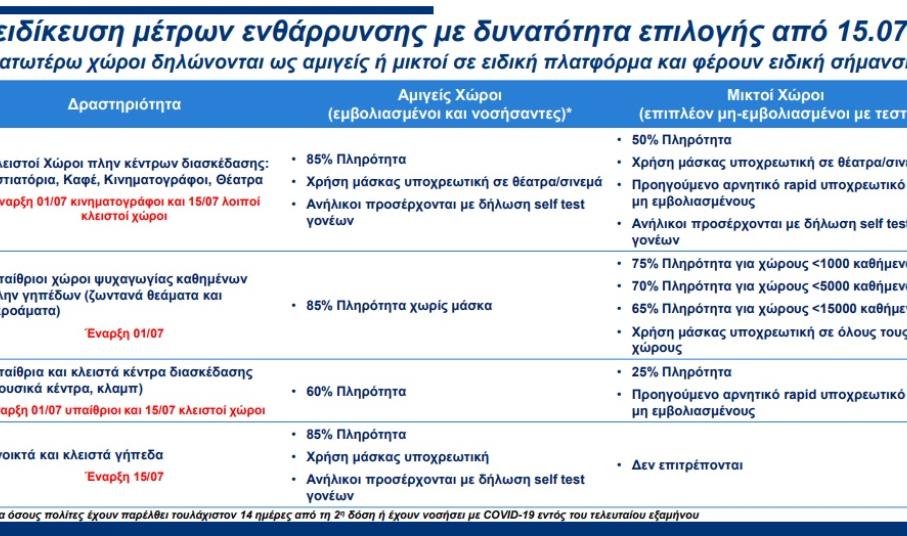 Αναλυτικά τα μέτρα για εστίαση και χώρους ψυχαγωγίας αναφέρονται στον σχετικό πίνακα ενώ διευκρινίζεται πως από 15 Ιουλίου θα είναι ανοικτή και σε λειτουργία η πλατφόρμα του αρμόδιου Υπουργείου με την οποίαν θα γίνεται ο σχετικός έλεγχος των επιχειρήσεων και των εμβολιασμένων ή μη, πολιτών.
