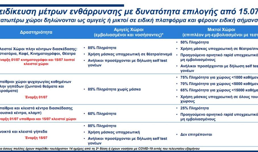3. Υπαίθρια και κλειστά κέντρα διασκέδασης (μουσικά κέντρα, κλαμπ). Έναρξη 01/07 για τους υπαίθριους και 15/07 για τους κλειστούς. Στους ανωτέρω χώρους που θα είναι αμιγείς θα ισχύει πληρότητα στο 60% ενώ σε όσους θα είναι μικτοί εφαρμόζονται τα ακόλουθα: 25% πληρότητα και προηγούμενο αρνητικό rapid υποχρεωτικό για μη εμβολιασμένους.