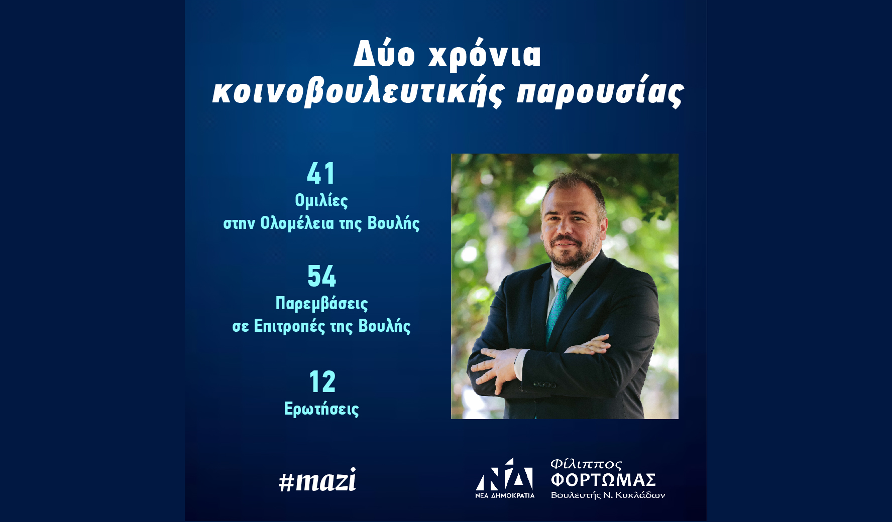 Με αφορμή την παρέλευση δύο ετών από την εκλογή του Φ. Φόρτωμα στη θέση του Βουλευτή Κυκλάδων με το κόμμα της Ν.Δ., ο βουλευτής εξέδωσε σχετική ανακοίνωση, ενημερώνοντας αναφορικά με το κοινοβουλευτικό του έργο στο διάστημα αυτό.