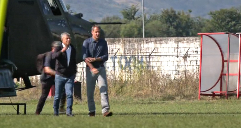 Στο γήπεδο της Καρδίτσας προσγειώθηκε λίγο μετά τις 10:30 το ελικόπτερο με το οποίο ο πρωθυπουργός Κυριάκος Μητσοτάκης πραγματοποίησε νωρίτερα αυτοψία πάνω από τις πληγείσες περιοχές.