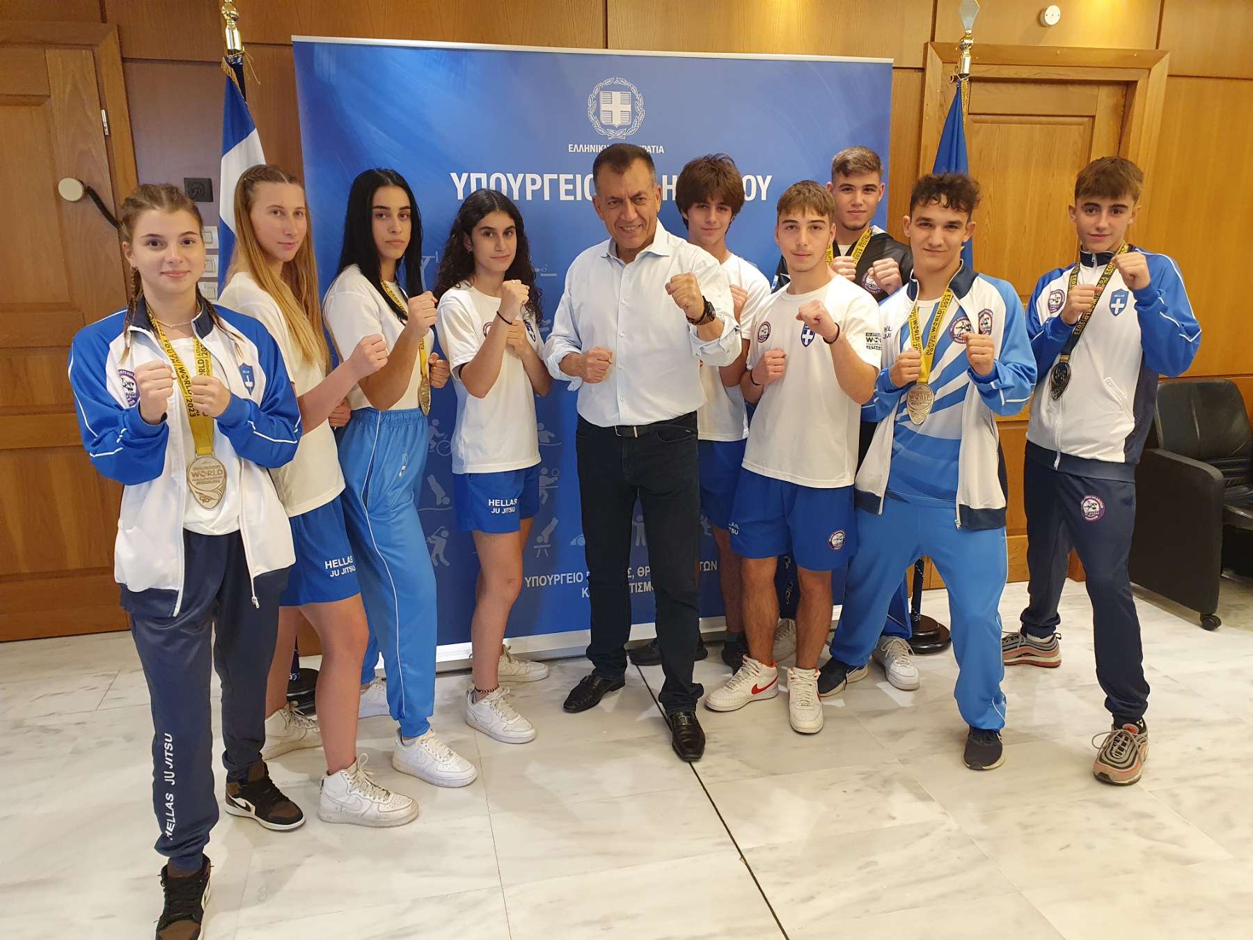Ο αναπληρωτής Υπουργός Παιδείας, Θρησκευμάτων και Αθλητισμού, κ.Γιάννης Βρούτσης, υποδέχτηκε την Τρίτη 26 Σεπτεμβρίου 2023 στα γραφεία της Γενικής Γραμματείας Αθλητισμού και τίμησε αθλητές της Εθνικής Ομάδας Ju Jitsu, που κατέκτησαν την 1η και 2η θέση στο Παγκόσμιο Πρωτάθλημα Νέων,Εφήβων, που διεξήχθη μεταξύ 20-26 Αυγούστου 2023, στην Αστάνα του Καζακστάν. Ο Υπουργός συνομίλησε με τους νεαρούς αθλητές, τους ομοσπονδιακούς προπονητές τους, καθώς και την πρόεδρο και τα μέλη της Ομοσπονδίας και τους συνεχάρη για την εντυπωσιακή παρουσία της χώρας μας στο Παγκόσμιο πρωτάθλημα.