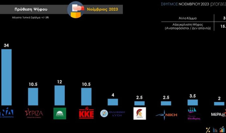 Πιο συγκεκριμένα, στην πρόθεση ψήφου (χωρίς άκυρο, λευκό και αποχή) η εκλογική επιρροή της ΝΔ φτάνει στο 34%, του ΠαΣοΚ στο 12%, του ΣΥΡΙΖΑ-ΠΣ και του ΚΚΕ στο 10,5%, της Ελληνικής Λύσης στο 4%, της Πλεύσης Ελευθερίας στο 3,5%, της Νίκης και των Σπαρτιατών στο 2,5%, του ΜεΡΑ25 στο 2%.
