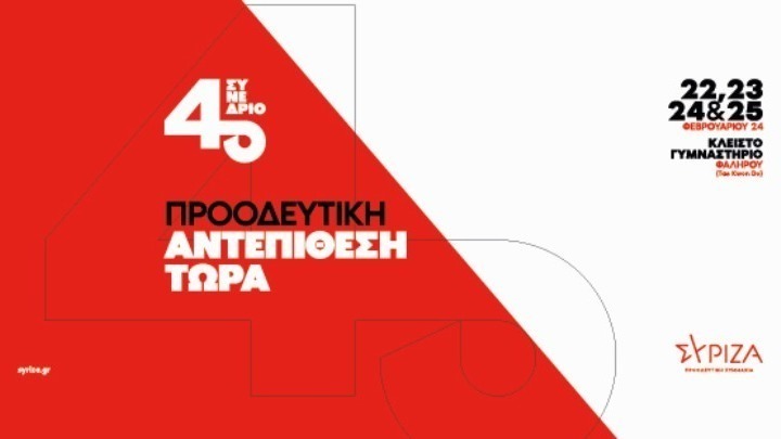Αρχίζουν σήμερα Πέμπτη οι εργασίες του 4ου συνεδρίου του ΣΥΡΙΖΑ-ΠΡΟΟΔΕΥΤΙΚΗ ΣΥΜΜΑΧΙΑ, με κεντρικό σύνθημα «προοδευτική αντεπίθεση τώρα», το οποίο θα διεξαχθεί στις εγκαταστάσεις του Σταδίου Tae Kwon Do, στο Παλαιό Φάληρο, μέχρι την Κυριακή 25 Φεβρουαρίου.
