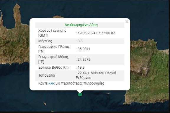 Σεισμική δόνηση σημειώθηκε το πρωί της Κυριακής στην Κρήτη. Σύμφωνα με το Γεωδυναμικό Ινστιτούτο, το μέγεθος η ένταση του σεισμού ανέρχεται στα 3,8 Ρίχτερ ενώ το επίκεντρο εντοπίζεται 22 χιλιόμετρα ΝΝΔ του Πλακιά Ρεθύμνου.
