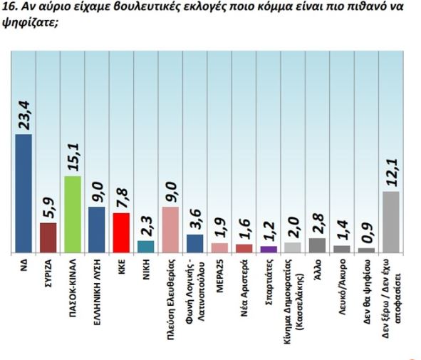 Ειδικότερα, σύμφωνα με τη δημοσκόπηση για λογαριασμό του Flash.gr,στην πρόθεση ψήφου η ΝΔ εμφανίζει ποσοστό 23,4% με το ΠΑΣΟΚ να ακολουθεί στο 15,1%. Στην τρίτη θέση βρίσκονται Πλεύση Ελευθερίας και Ελληνική Λύση με 9% και ακολουθούν ΚΚΕ στην τέταρτη θέση με 7,8% και ΣΥΡΙΖΑ με 5,9%. Η Νίκη συγκεντρώνει 2,3%, ενώ η Φωνή Λογικής 3,6%.