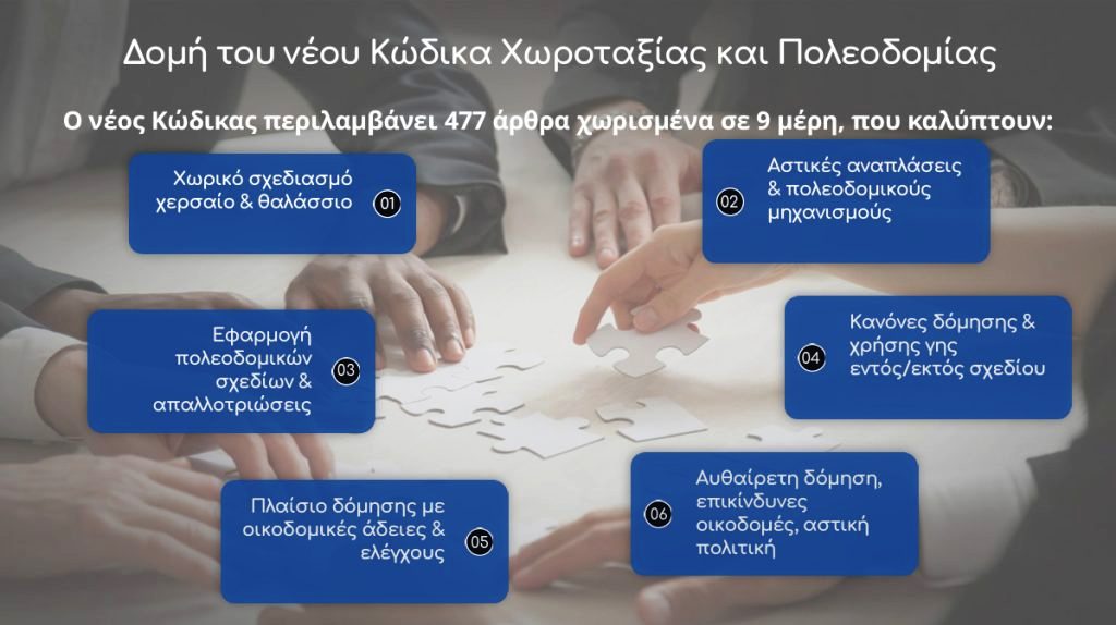 - οι μηχανικοί, οι νομικοί και όλοι οι πολίτες αποκτούν πλέον σαφείς κανόνες σχετικά με τη δόμηση, τα αυθαίρετα, τις χρήσεις γης, τις αστικές αναπλάσεις κ.λπ.,