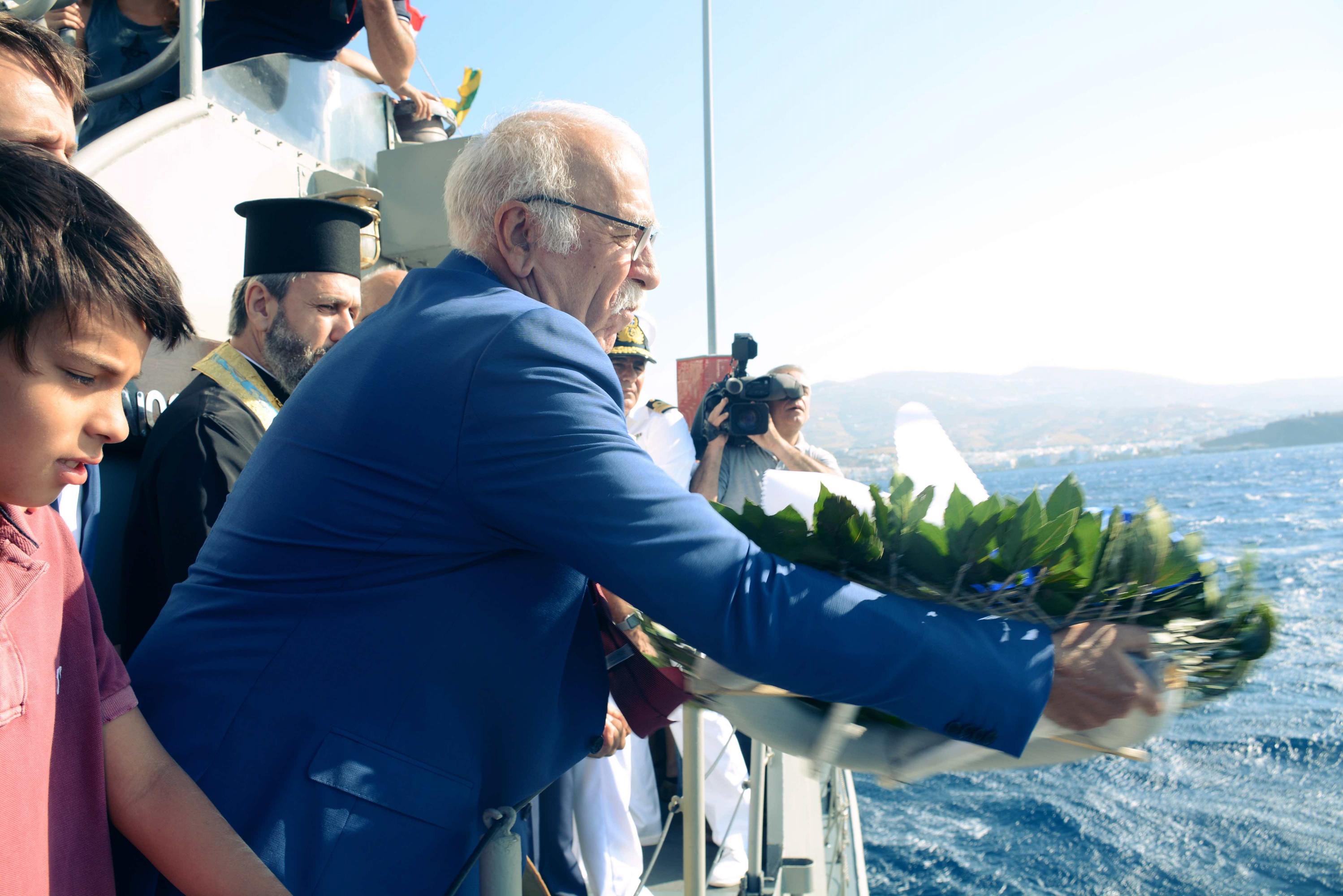 Ο Αναπληρωτής Υπουργός Εθνικής Άμυνας Δημήτρης Βίτσας, συνοδευόμενος από το Αρχηγό ΓΕΝ Αντιναύαρχο Νικόλαο Τσούνη ΠΝ, παρέστη σήμερα Τρίτη 15 Αυγούστου 2017, στις εκδηλώσεις για τον εορτασμό της Κοιμήσεως της Θεοτόκου και την 77η επέτειο από τον τορπιλισμό του Κ/Δ «ΕΛΛΗ», που πραγματοποιήθηκαν στην Τήνο.