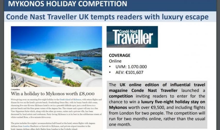 Αποτέλεσμα της εν λόγω καμπάνιας προβολής της Marketing Greece, μία σειρά νέων δημοσιογραφικών αναφορών από σοβαρά ΜΜΕ διεθνούς απήχησης, που εστιάζουν μεταξύ άλλων, στη Μήλο, τη Μύκονο, καθώς επίσης και τη Νάξο, την Πάρο, την Αντίπαρο, τη Σαντορίνη και την Τήνο.