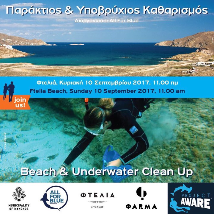 Ο Δήμος Μυκόνου στηρίζει την εθελοντική πρωτοβουλία του Παγσκόσμιου Οργανισμού All for Blue, για τον παράκτιο και υποβρύχιο καθαρισμό της παραλίας Φτελιάς.