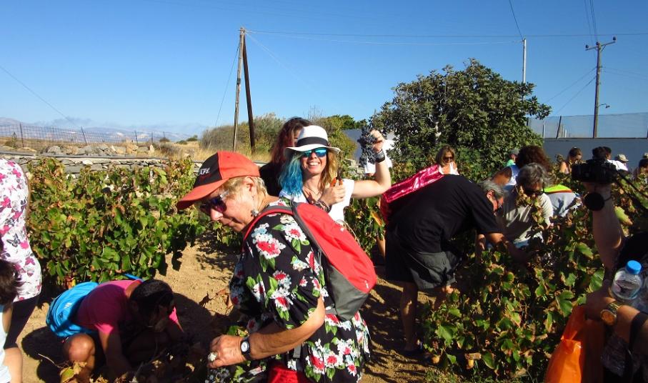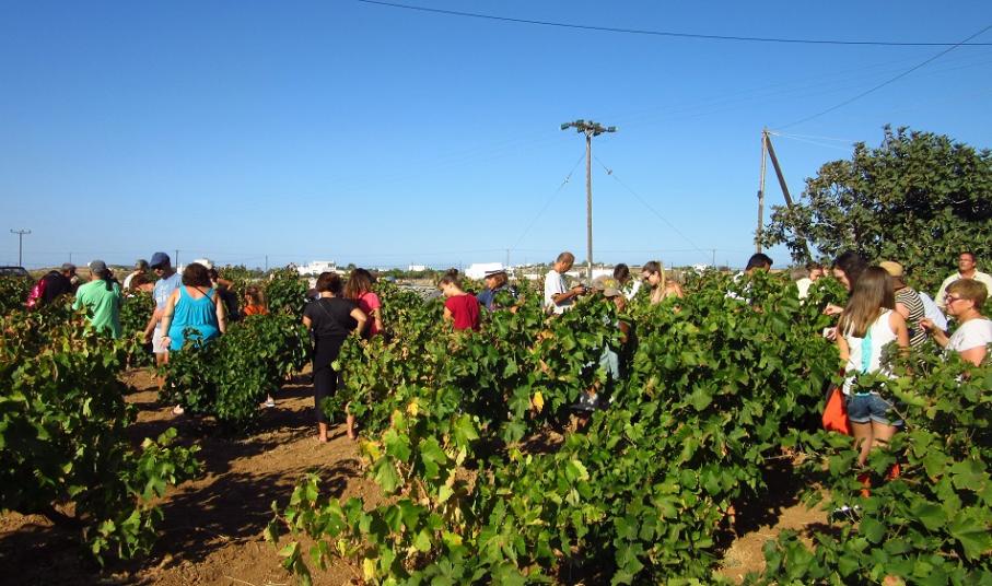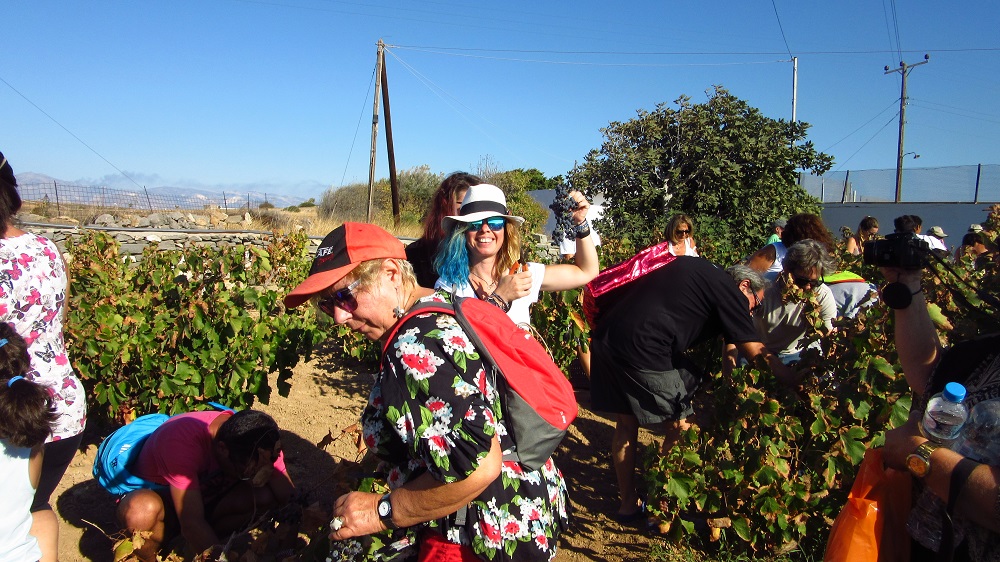 Στο πρώτο μέρος της ημερίδας οι συμμετέχοντες πήραν μέρος στον τρύγο και το πάτημα των σταφυλιών με παραδοσιακό τρόπο στο κτήμα του κυρίου Κώστα Χασούρη, ο οποίος και τους εξήγησε όλη τη διαδικασία και είχε φροντίσει κάθε λεπτομέρεια με τη βοήθεια της συζύγου του Βάσως, που έδειξε και τη διαδικασία παρασκευής μουσταλευριάς και πετιμεζιού, καθώς και της υπόλοιπης οικογένειάς του!