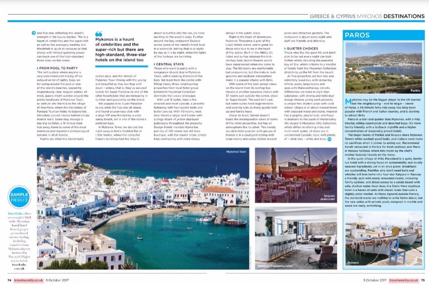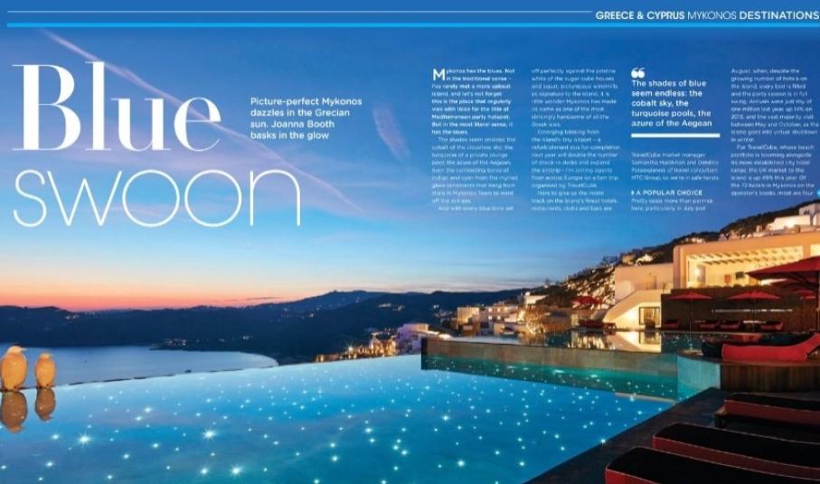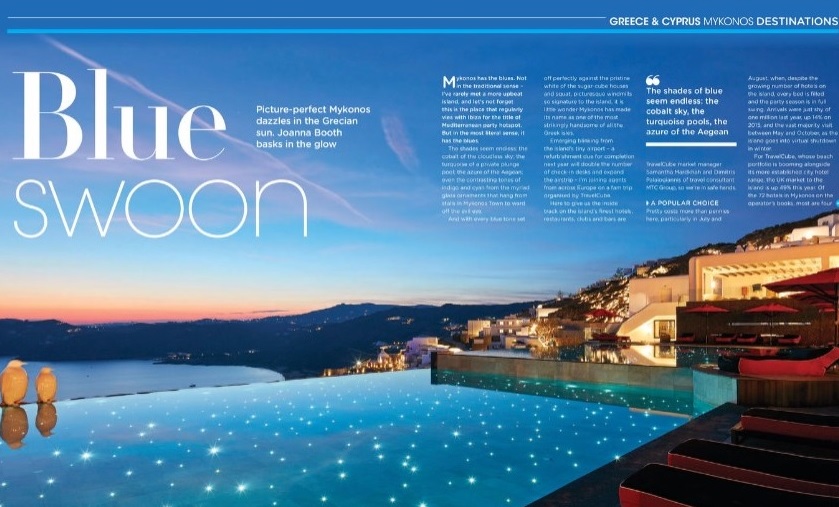 Στο εκτενές αφιέρωμα, η δημοσιογράφος του βρετανικού περιοδικού αναφέρεται στο ταξίδι που οργάνωσε η MTC GROUP σε συνεργασία με την Travel Cube και τους Δήμους Μυκόνου και Πάρου το Μάιο, στο οποίο συμμετείχαν και ταξιδιωτικοί πράκτορες από την Ευρώπη με το δίκτυο της GTA για τη δημιουργία νέων συνεργασιών με τους επαγγελματίες.