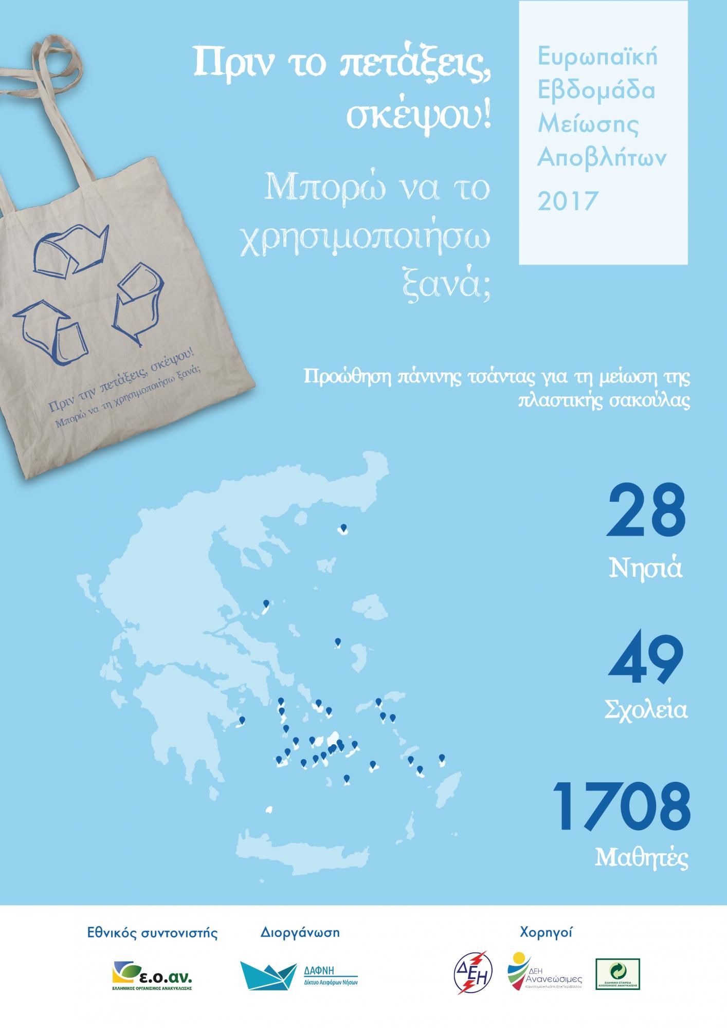 “Πριν το πετάξεις, σκέψου! Μπορείς να το χρησιμοποιήσεις ξανά;” Με αυτό το σλόγκαν το Δίκτυο ΔΑΦΝΗ σε συνεργασία με τον Ελληνικό Οργανισμό Ανακύκλωσης (Ε.Ο.ΑΝ) και την υποστήριξη των ΔΕΗ, ΕΕΑΑ και ΔΕΗ Ανανεώσιμες πραγματοποιεί το διάστημα 20-24 Νοεμβρίου δράσεις ευαισθητοποίησης σε 28 νησιά-μέλη του, μοιράζοντας πάνινες τσάντες σε 49 σχολεία και περισσότερους από 1700 μαθητές Γυμνασίων-Λυκείων!