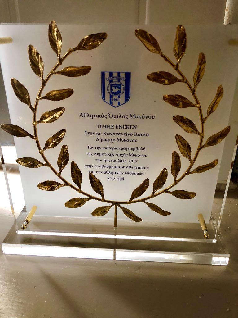 Στο πρόσωπο του Δημάρχου Μυκόνου κ. Κωνσταντίνου Κουκά, ο Αθλητικός Όμιλος Μυκόνου τίμησε τη Δημοτική Αρχή για την καθοριστική συμβολή της στην αναβάθμιση του αθλητισμού και των αθλητικών υποδομών στο νησί, κατά την τριετία 2014 - 2017.