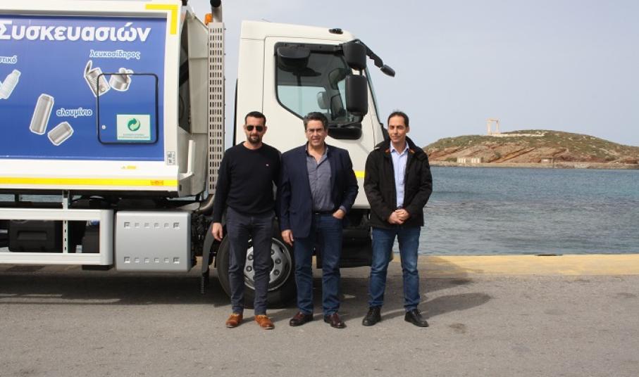 Στο πλαίσιο του επανασχεδιασμού της λειτουργίας της ανακύκλωσης, ο Δήμος Νάξου και Μικρών Κυκλάδων παρέλαβε σήμερα ένα καινούριο όχημα αποκομιδής ανακυκλώσιμων υλικών. Το νέο απορριμματοφόρο, όπως κι οι 300 μπλε κάδοι ανακύκλωσης, οι οποίοι έχουν ήδη παραληφθεί, είναι δωρεά της Ελληνικής Εταιρείας Αξιοποίησης Ανακύκλωσης, με την οποία έχει συμβληθεί ο Δήμος με στόχο την επανέναρξη και λειτουργία της ανακύκλωσης.
