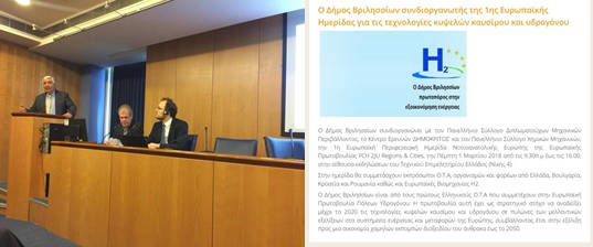 Ο Δήμος Βριλησσίων συνδιοργάνωσε με τον Πανελλήνιο Σύλλογο Διπλωματούχων Μηχανικών Περιβάλλοντος, το Κέντρο Ερευνών "ΔΗΜΟΚΡΙΤΟΣ" και τον Πανελλήνιο Σύλλογο Χημικών Μηχανικών την 1η ευρωπαϊκή περιφερειακή ημερίδα «Κυψέλες Καυσίμου & Υδρογόνο» της Ευρωπαϊκής Πρωτοβουλίας FCH 2JU Regions & Cities, την Πέμπτη 1 Μαρτίου 2018, στα γραφεία του Τ.Ε.Ε. στην Αθήνα.