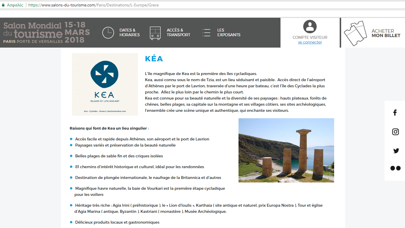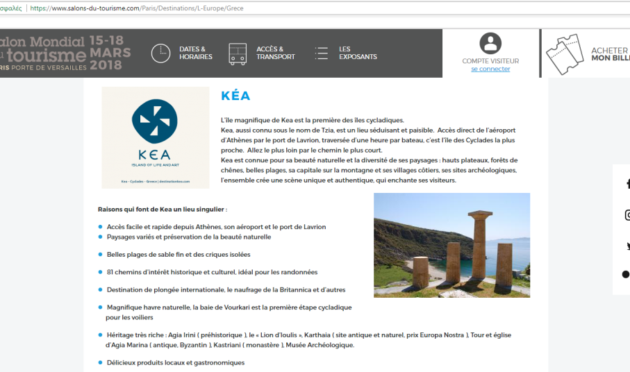 Η Κέα ως κορυφαίος ελληνικός προορισμός στο επίσημο site της Διεθνούς έκθεσης Τουρισμού Salon Mondial du Tourisme στο Παρίσι