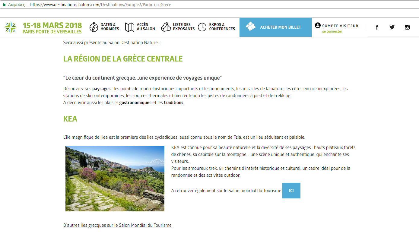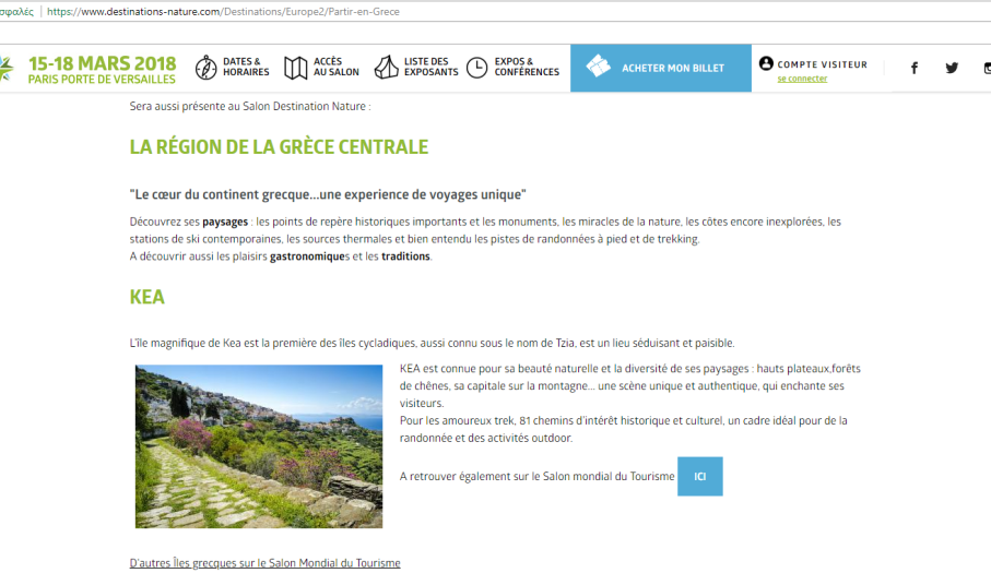 Η άλλη βρίσκεται στο επίσημο site της παράλληλης έκθεσης για προορισμούς με φυσικό κάλλος και προβάλει τα μονοπάτια της Κέας.