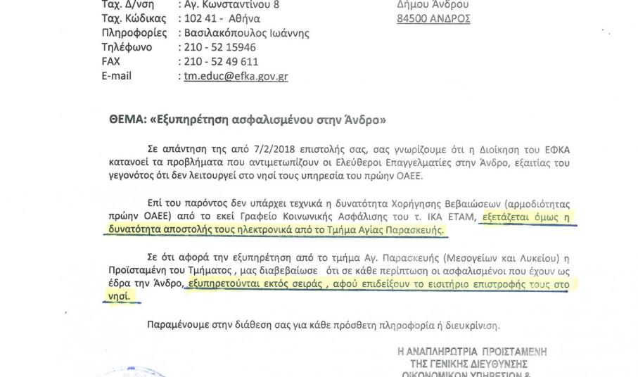 Είμαι στην ευχάριστη θέση να σας ανακοινώσω ότι μετά την αποστολή της από 07/02/2018 επιστολής μου προς τον Πρόεδρο του Ε.Φ.Κ.Α., στην οποία ανέφερα την μεγάλη ταλαιπωρία που υφιστάμεθα όλοι εμείς οι επαγγελματίες της Άνδρου όταν χρειαζόμαστε κάποια βεβαίωση από τον πρώην (Ο.Α.Ε.Ε.), την οποία και είχα αναρτήσει, η απάντηση από την Διοίκηση του φορέα αρχικά μας ικανοποιεί και μας χαροποιεί ιδιαίτερα. Από τις 14/03/2018 λοιπόν, όποιος επαγγελματίας από το Νησί μας επιδεικνύει το εισιτήριο επιστροφής, δεν θα περιμένει σε καμία ουρά και θα εξυπηρετείται κατά προτεραιότητα. Επίσης, εξετάζεται η περίπτωση ηλεκτρονικής αποστολής των βεβαιώσεων χωρίς να χρειάζεται να ταξιδέψουμε στην Αθήνα για αυτό. Ευχαριστούμε για την άμεση ανταπόκριση από πλευράς Διοίκησης Ε.Φ.Κ.Α. και περιμένουμε για την εφαρμογή των ανωτέρω στην πράξη.