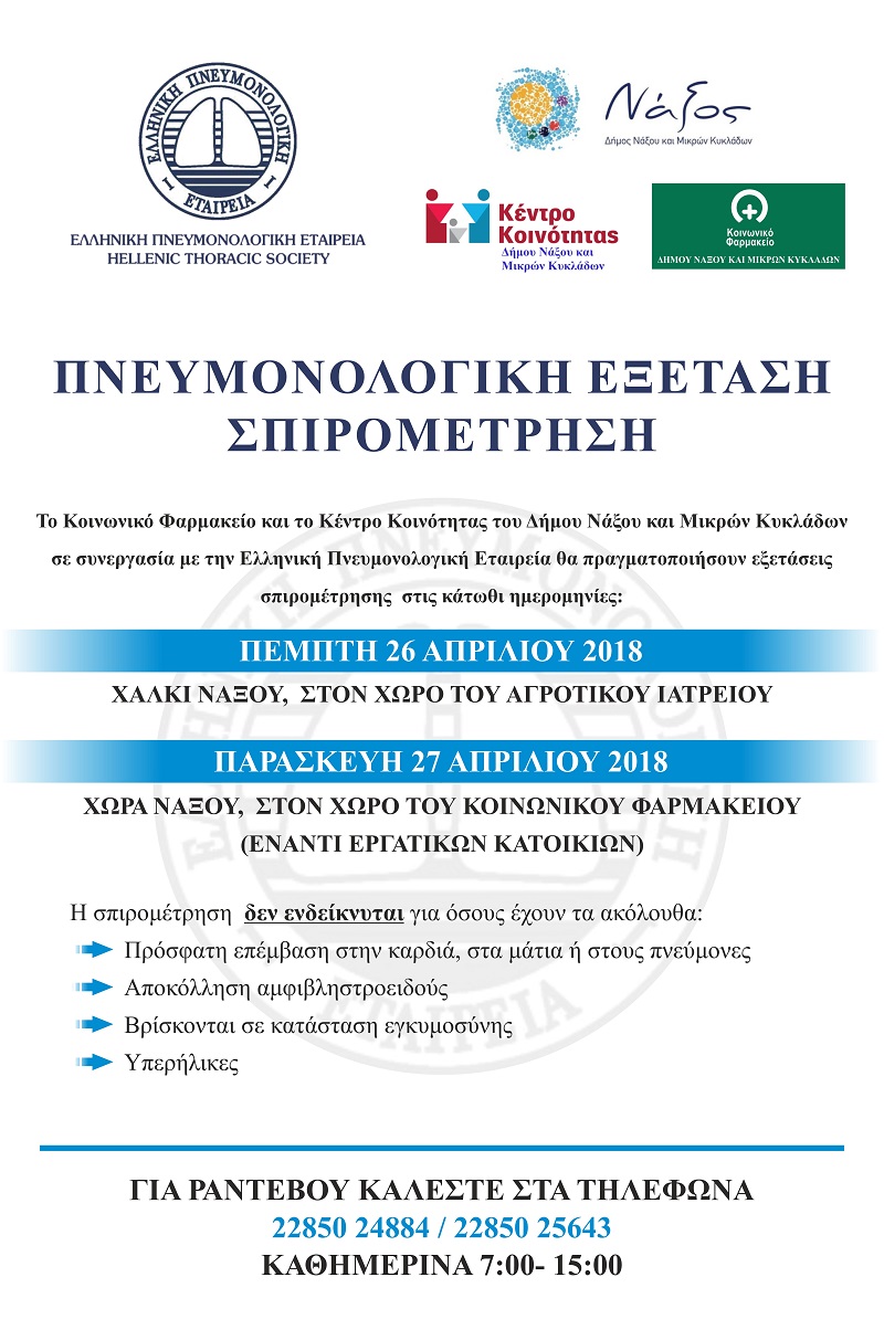 Το Κοινωνικό Φαρμακείο και το Κέντρο Κοινότητας του Δήμου Νάξου και Μικρών Κυκλάδων σε συνεργασία με την Ελληνική Πνευμονολογική Εταιρεία θα πραγματοποιήσουν εξετάσεις σπιρομέτρησης στις 26-27/4/2018. Οι εξετάσεις θα γίνουν την Πέμπτη 26/4/2018 στο Χαλκί, στον χώρο του Αγροτικού Ιατρείου, ενώ την Παρασκευή 27/4/2018 θα πραγματοποιηθούν στη Χώρα, στον χώρο του Κοινωνικού Φαρμακείου, το οποίο στεγάζεται επί της περιφερειακής οδού Χώρας-Εγγαρών, απέναντι από τις Εργατικές Κατοικίες. Ώρες διεξαγωγής 9:30- 14:00.