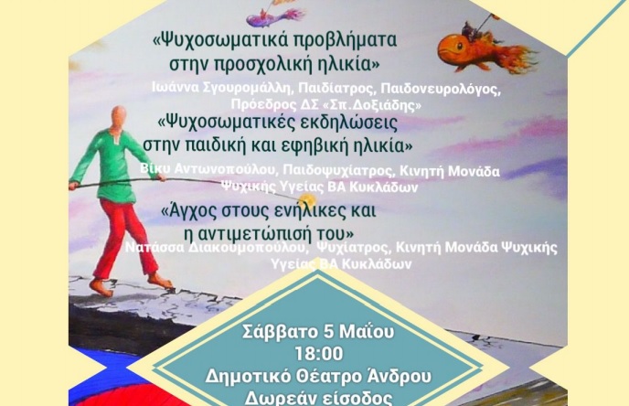Στo πλαίσιο των δράσεων ευαισθητοποίησης της τοπικής κοινωνίας σε θέματα ψυχικής υγείας, που αναπτύσσει στην Άνδρο η Κινητή Μονάδα Ψυχικής Υγείας Β.Α. Κυκλάδων ΕΠΑΨΥ, διοργανώνεται, με την υποστήριξη του Δήμου Άνδρου, ημερίδα με θέμα «Άγχος και ψυχοσωματικές εκδηλώσεις στα παιδιά και στους ενηλίκους».