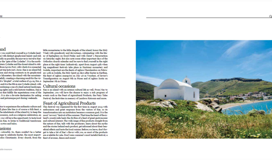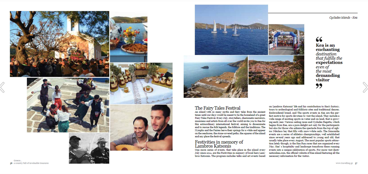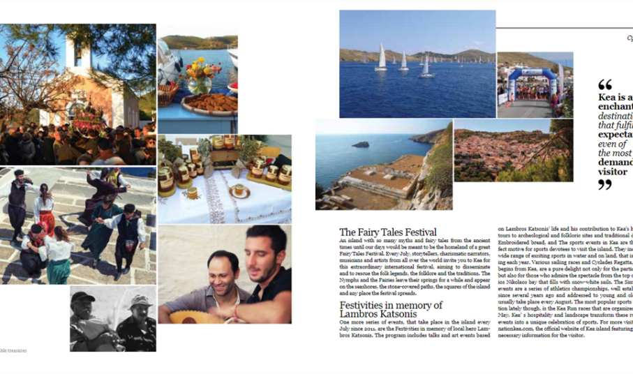 Στις σελίδες που φιλοξενείται η Κέα, παρουσιάζεται το νησί μας σαν ένας ξεχωριστός προορισμός με πλούσιο πολιτισμικό υπόβαθρο που ικανοποιεί τις προσδοκίες και του πιο απαιτητικού επισκέπτη. Στο αφιέρωμα παρουσιάζονται τα φεστιβάλ, τα πανηγύρια, οι γιορτές και οι αθλητικές διοργανώσεις που αποτελούν μοναδικές αφορμές για να επισκεφτεί κανείς την Κέα και να απολαύσει την γνησιότητα της. Η παραδοσιακή μουσική, ο χορός, οι τοπικές γεύσεις και τα Τζιώτικα προϊόντα, τα όμορφα τοπία και οι αρχαιολογικοί θησαυροί της Κέας πλαισιώνουν κάθε τέτοια περίσταση. Μία ώρα μόλις από την Αθήνα, η Κέα με την κυκλαδίτικη γοητεία της, περιμένει όσους αναζητούν έναν αυθεντικό προορισμό. Περισσότερες πληροφορίες για τον προορισμό της Κέας θα βρείτε και στην επίσημη τουριστική ιστοσελίδα του νησιού destinationkea.com.