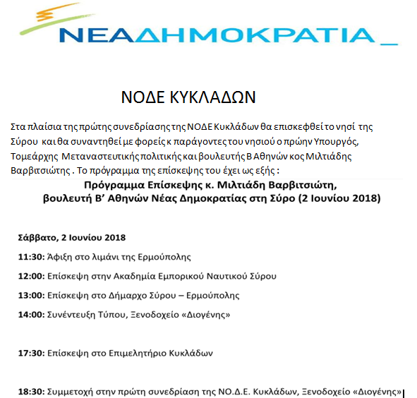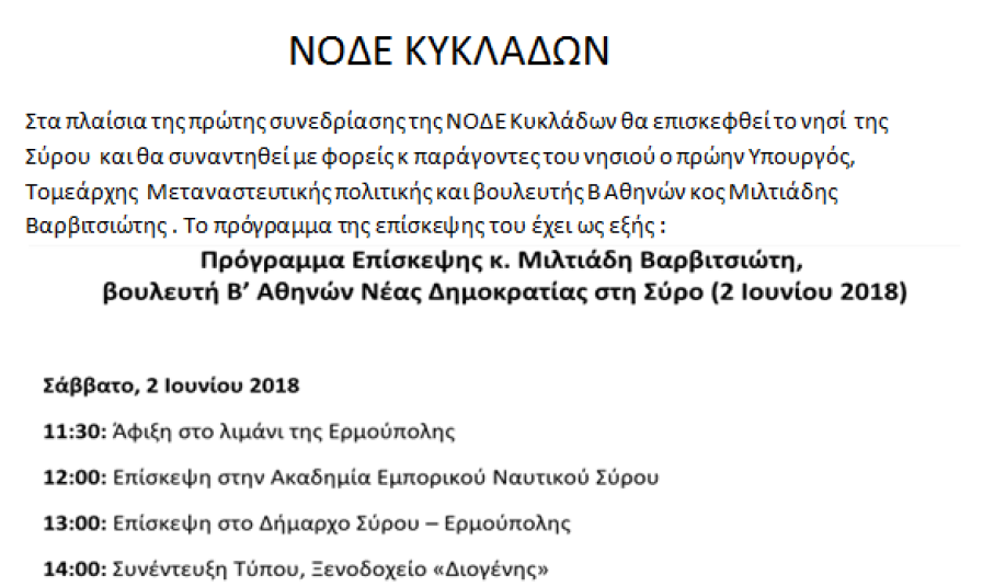 Τη Σύρο θα επισκεφθεί το Σάββατο 2 Ιουνίου ο βουλευτής Β΄ Αθηνών της Νέας Δημοκρατίας, Μιλτιάδης Βαρβιτσιώτης, ο οποίος θα παραστεί και στην πρώτη συνεδρίαση της ΝΟΔΕ Κυκλάδων με πρόεδρο τον Χρήστο Καφτηράνη.
